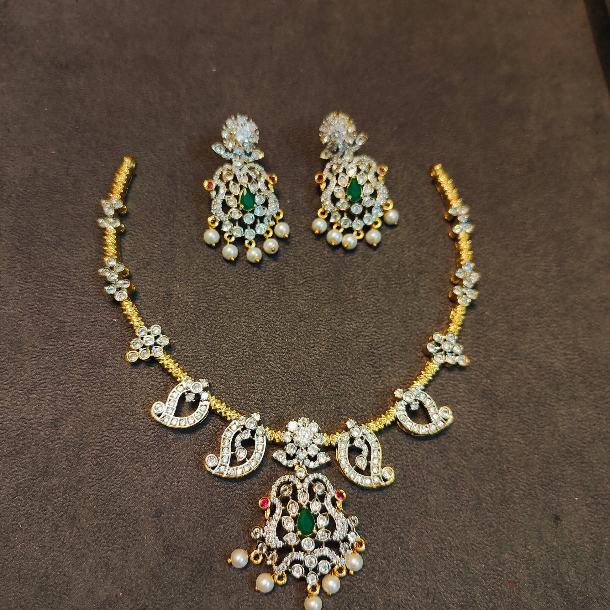 Elevate your festive and bridal looks with this exquisite CZ necklace set, beautifully crafted with shimmering stones and elegant emerald accents. The necklace features a delicate floral chain design paired with intricate paisley motifs, leading to a stunning central pendant embellished with emerald-green stones and pearl drops.