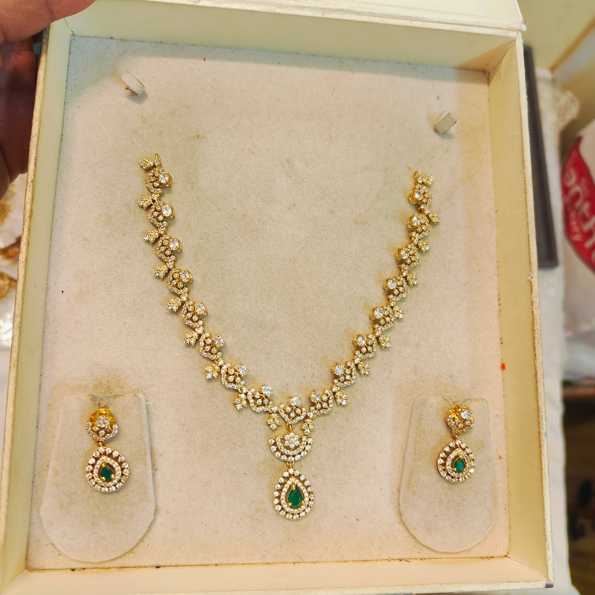 Add a touch of timeless charm with this Emerald Elegance CZ Necklace Set, beautifully crafted with shimmering cubic zirconia stones. The delicate floral design necklace is highlighted by a stunning pear-shaped green stone pendant, encircled with sparkling CZs for a luxurious finish. Paired with matching drop earrings featuring the same emerald green centerpiece, this set is perfect for weddings, festive occasions, and elegant evening wear.