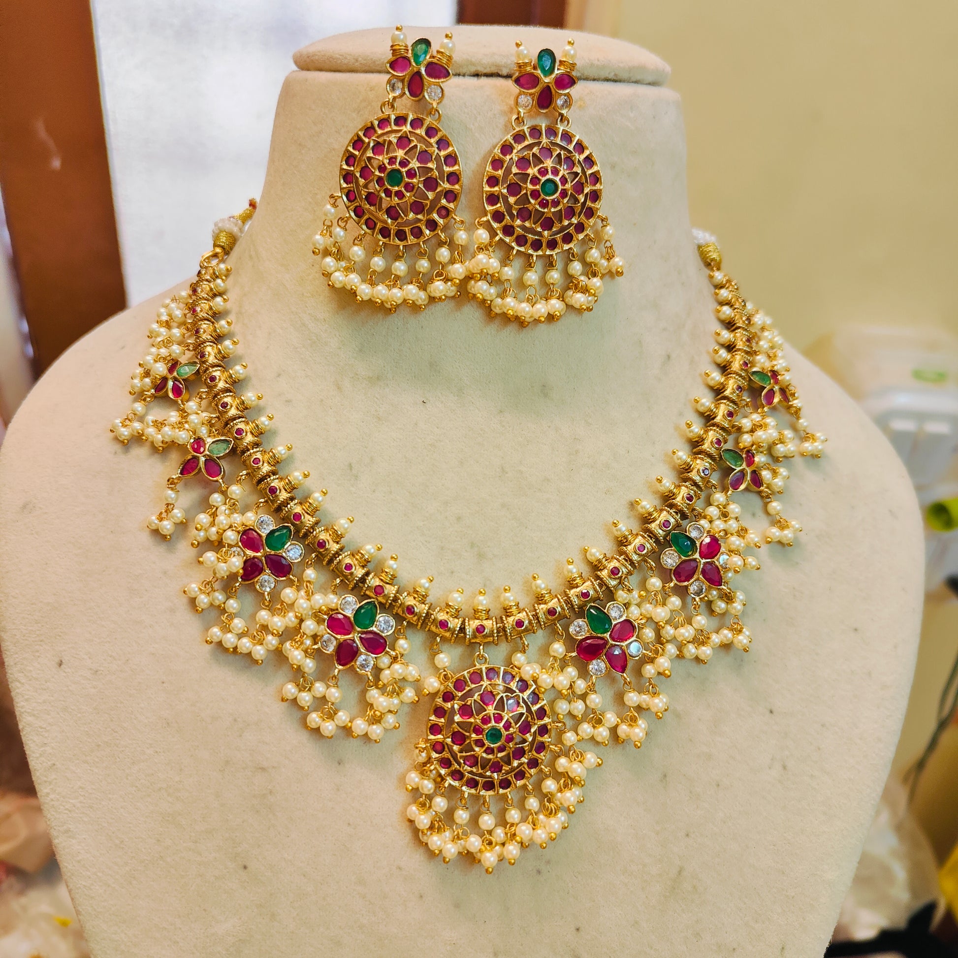This exquisite necklace set showcases a timeless South Indian design, beautifully crafted with intricate detailing. The necklace features floral motifs adorned with vibrant red and green Kemp stones, enhanced by clusters of shimmering pearls that form an elegant fringe. At the center, a grand circular pendant adds a statement touch, perfectly complemented by matching chandbali-style earrings. Finished in rich antique gold polish, this set is ideal for weddings, festive occasions, and traditional celebrations, bringing a regal charm and graceful elegance to any attire.