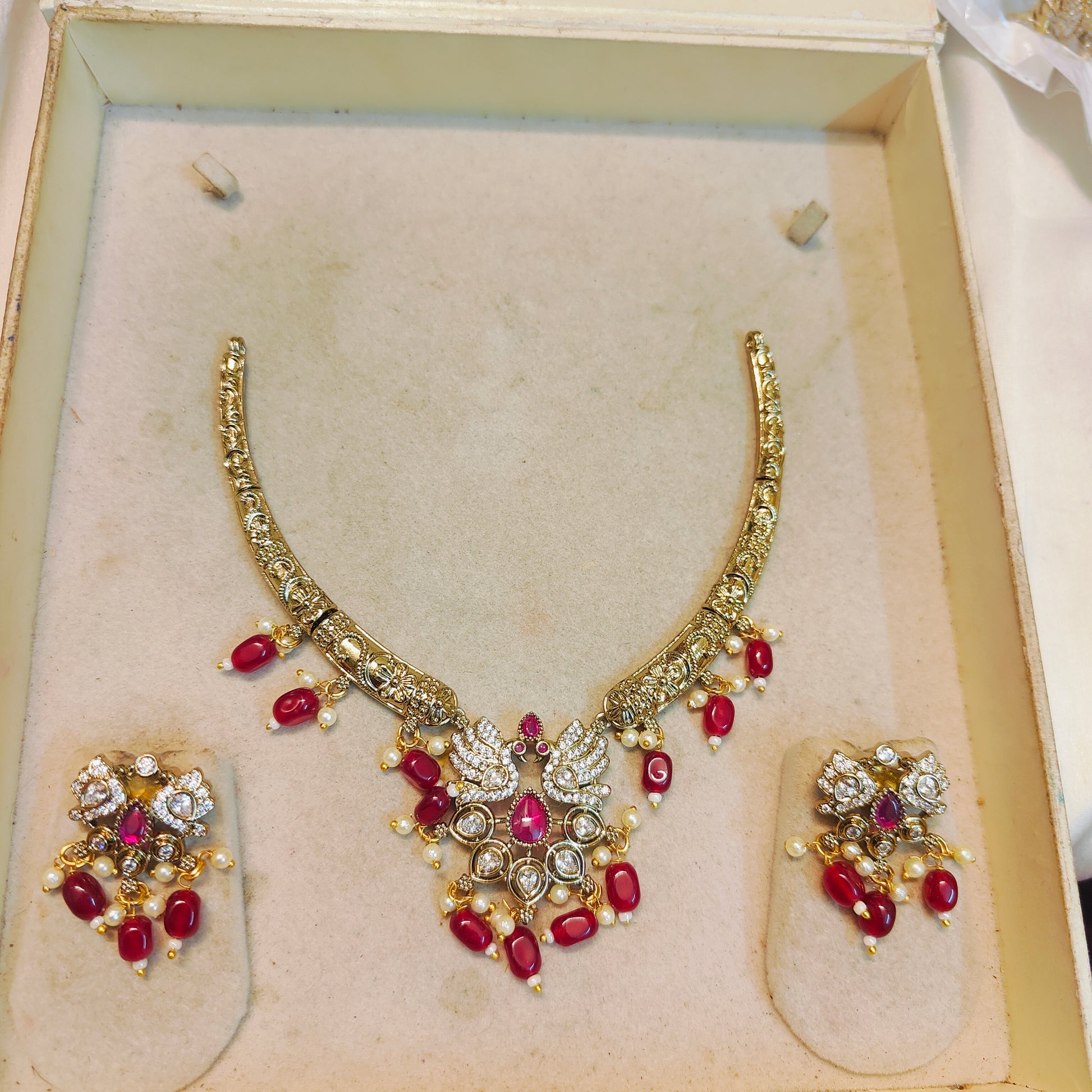 Exude timeless elegance with this stunning antique gold necklace set, beautifully crafted with intricate detailing. Adorned with rich ruby red beads, sparkling white stones, and delicate pearl drops, this masterpiece blends classic charm with royal grace. The centerpiece features twin peacock motifs, symbolizing beauty and prosperity, making it perfect for bridal and festive occasions. Paired with matching earrings, this set adds a regal touch to any traditional attire.
