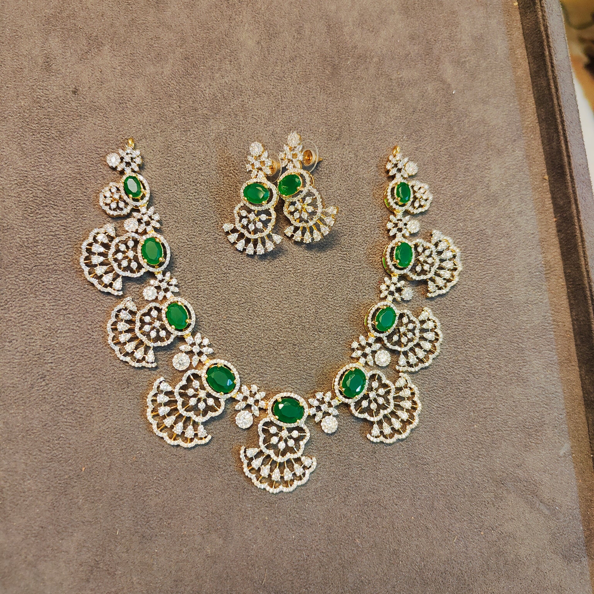 Make a statement with this exquisite gold-plated necklace set, featuring oval-cut green stones elegantly surrounded by sparkling CZ diamonds. Designed with intricate craftsmanship, this set is perfect for weddings, festive occasions, and grand celebrations. The delicate fan-shaped patterns and floral embellishments add a touch of regal charm, making it a must-have for jewelry lovers.