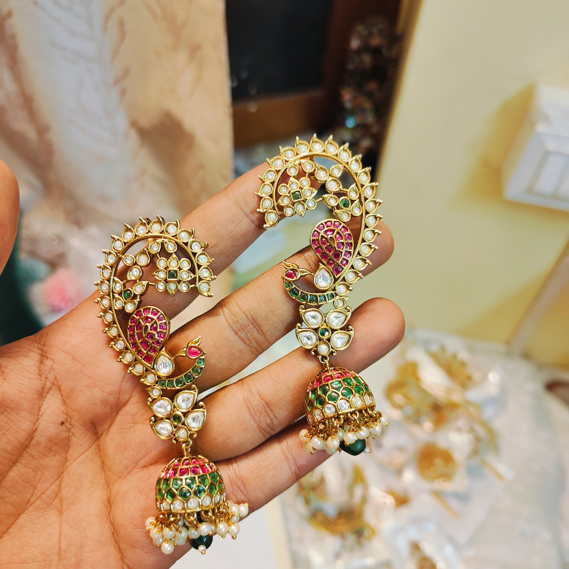 Elevate your festive look with these handcrafted peacock kundan jhumka earrings, designed in a stunning curved paisley silhouette. The intricate peacock motif is embellished with premium white kundan stones, ruby & green accents, and finished with a beautifully detailed jhumka dome adorned with pearls. The lightweight design makes them comfortable for long wear while still giving a grand temple jewellery appeal.